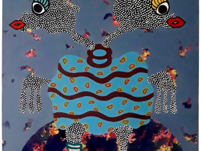 Au début dans le vide de l’univers, tout à commencé par le son « YO » incluant tout et surtout la conscience humaine. Koni, le dieu suprême et le créateur du monde, a selon la mythologie bambara créé 3 esprits dont Faro- l’esprit de l’eau, Pemba – l’esprit de la terre et Teliclo – l’esprit de l’air . A travers la création de deux sets de jumeaux le monde a été peuplé d’animaux et de plantes ainsi que d’êtres humains tous issus des graines d’acacias . L’ancrage des racines /pieds des personnages à la fois humain, végétal et animal est représenté dans les tableaux de Soul come une base solide et unitaire . Cet ancrage représente la racine de l’évolution de l’homme dans cette mythologie où « tout est venu de rien » mais est en harmonie avec la notion de racine commune de l’âme humaine .