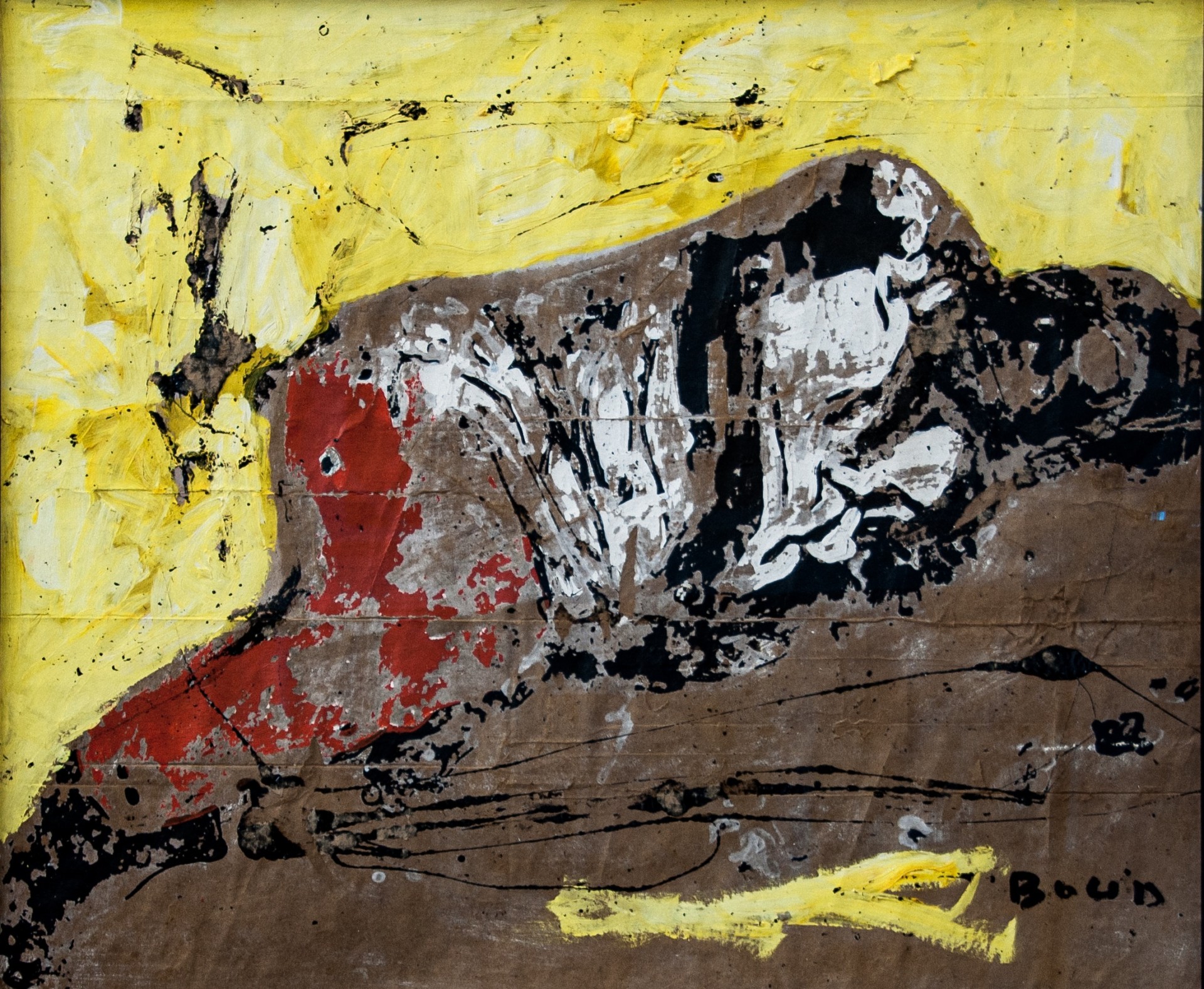 Les compositions d’Armand Boua se distinguent par une facture texturée grâce à l’usage du goudron, de l’acrylique, de papiers journal et de magazines mélés à des matériaux de récupération. Chaque couche est appliquée puis arrachée, dépouillée, laissant apparaitre des formes abstraites. Les mises en scènes sont, à l’image de la rue, déconstruites.