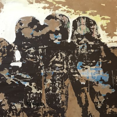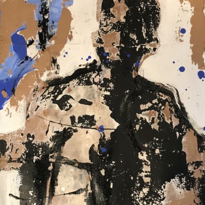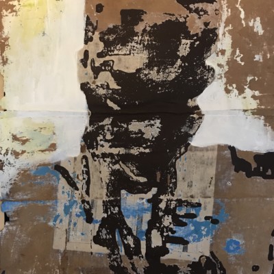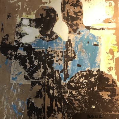 Les compositions d’Armand Boua se distinguent par une facture texturée grâce à l’usage du goudron, de l’acrylique, de papiers journal et de magazines mélés à des matériaux de récupération. Chaque couche est appliquée puis arrachée, dépouillée, laissant apparaitre des formes abstraites. Les mises en scènes sont, à l’image de la rue, déconstruites.
