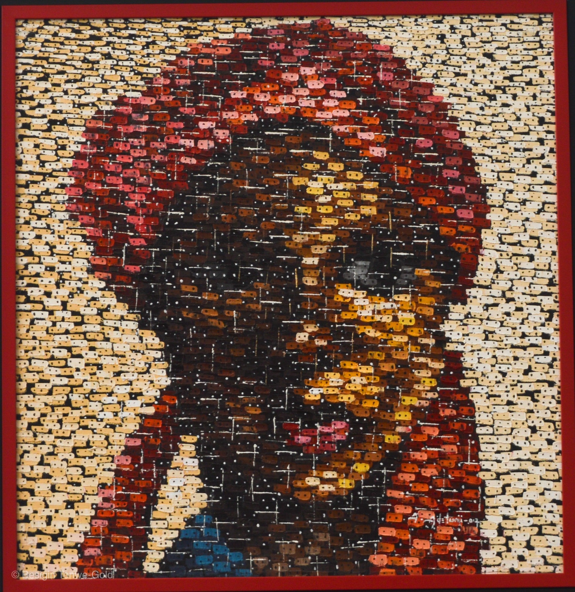 The small rectangles of colors are superimposed like the pieces of a puzzle to accurately restore the features of faces in the markets of Lagos.