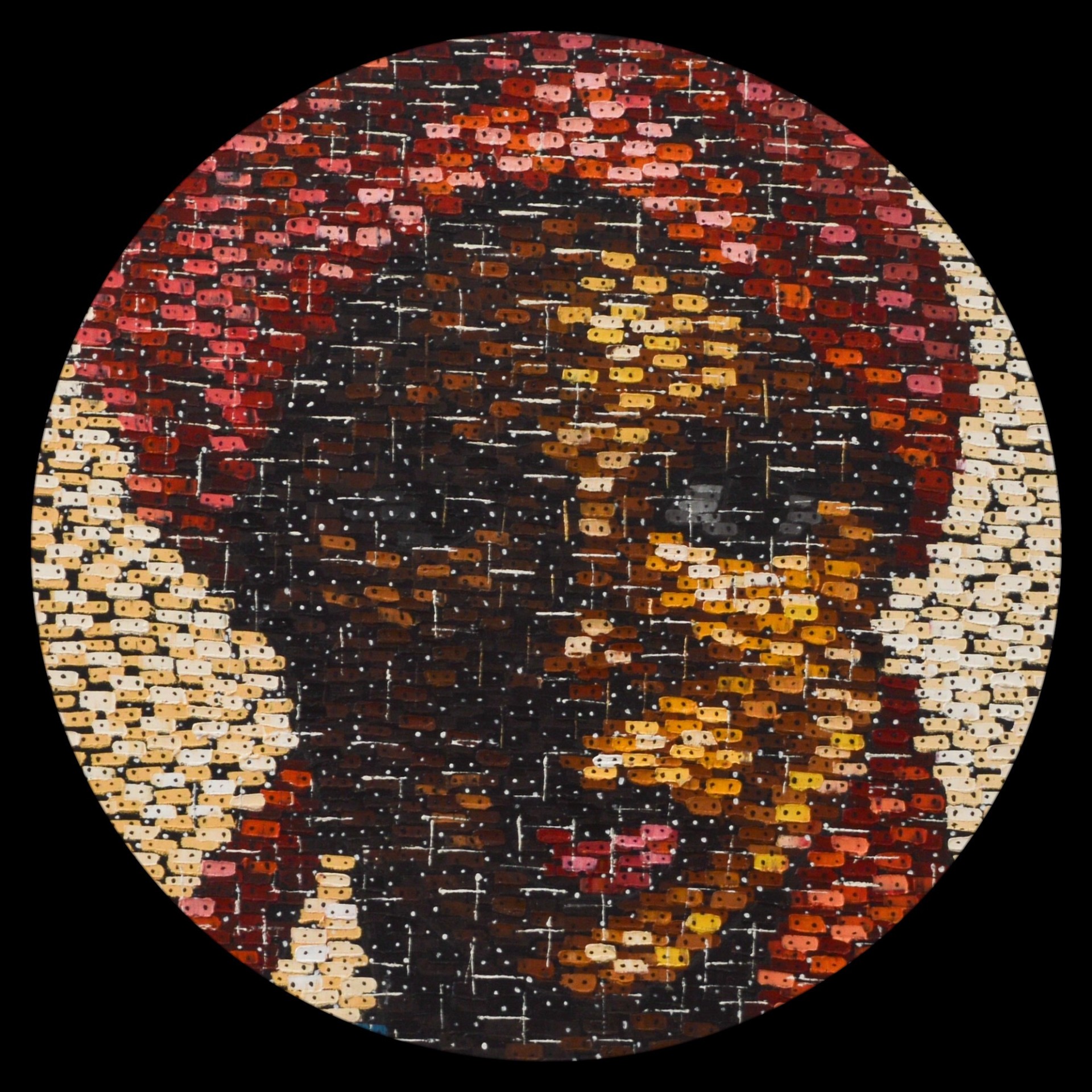 The artist of Nigerian origin works in the pointillist manner in his paintings.