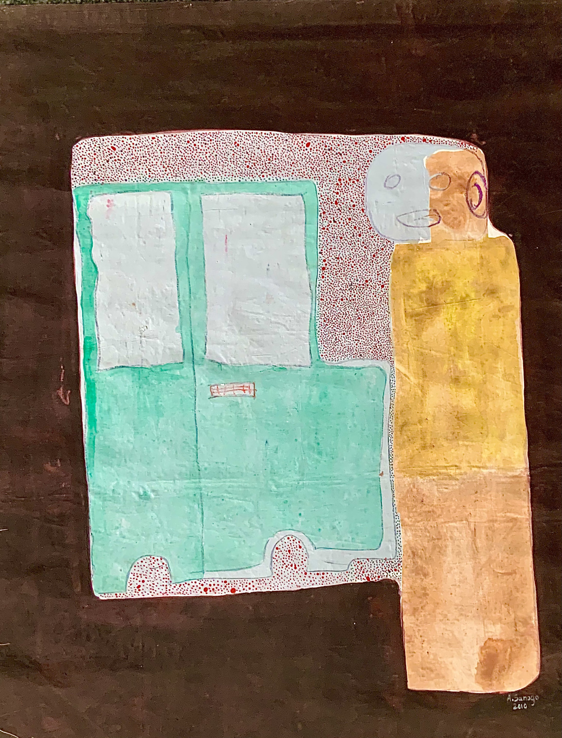 Cette toile sans titre est une acrylique peinte sur toile. Le personnage, unique, est peint en aplat rendant les formes de sa silhouette abstraites. L’ensemble des points alignés – dénominateur commun de nombreuses de ses toiles – sous entend un fil conducteur : celui du questionnement qui ne cesse jamais. Le questionnement et l’interrogation selon Sanogo font partie des atouts essentiels dans la vie d’un homme s’il veut progresser.