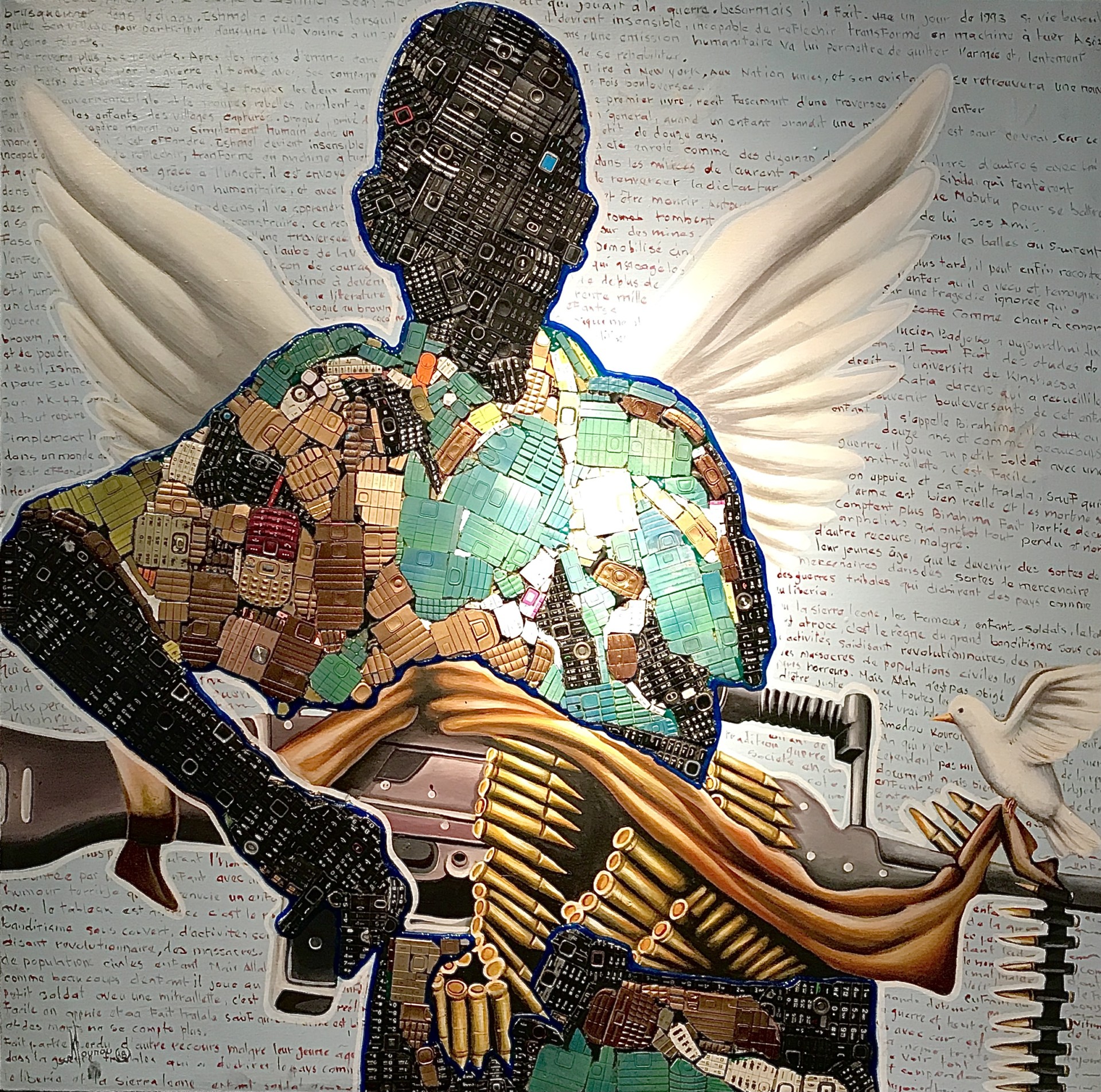 Pour cet artiste de la composition artistique résiduelle, Art et Recyclage ne font qu’un. Originaire de la Côte d’Ivoire, pays qui produit 1500 tonnes de déchets électroniques par an, Mounou a souhaité dénoncer une pollution galopante en l’intégrant dans son œuvre.