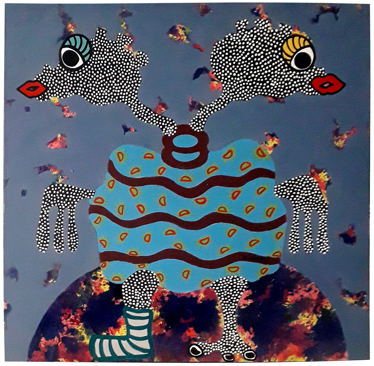 Au début dans le vide de l’univers, tout à commencé par le son « YO » incluant tout et surtout la conscience humaine. Koni, le dieu suprême et le créateur du monde, a selon la mythologie bambara créé 3 esprits dont Faro- l’esprit de l’eau, Pemba – l’esprit de la terre et Teliclo – l’esprit de l’air . A travers la création de deux sets de jumeaux le monde a été peuplé d’animaux et de plantes ainsi que d’êtres humains tous issus des graines d’acacias . L’ancrage des racines /pieds des personnages à la fois humain, végétal et animal est représenté dans les tableaux de Soul come une base solide et unitaire . Cet ancrage représente la racine de l’évolution de l’homme dans cette mythologie où « tout est venu de rien » mais est en harmonie avec la notion de racine commune de l’âme humaine .