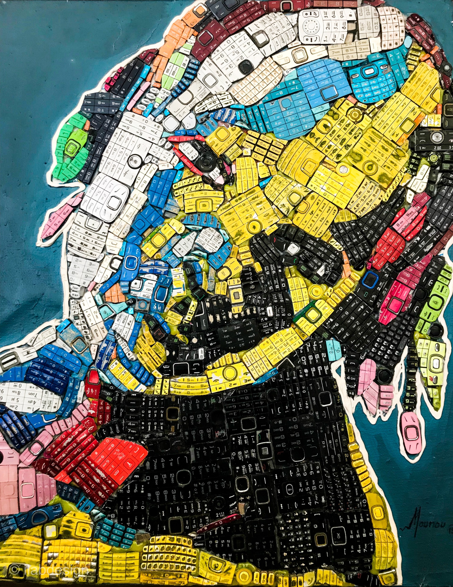 Mounou tire son inspiration de la récupération et de l’informel pour en faire des œuvres d’art. Hypersensible à la cause environnementale et aux problématiques de son époque: donner une seconde vie aux objets jetés, se jouer de la technologie high- tech sont pour lui une évidence. Claviers et écrans dessinent des silhouettes humaines insérés dans des décors urbains réalistes et hauts en couleurs.
