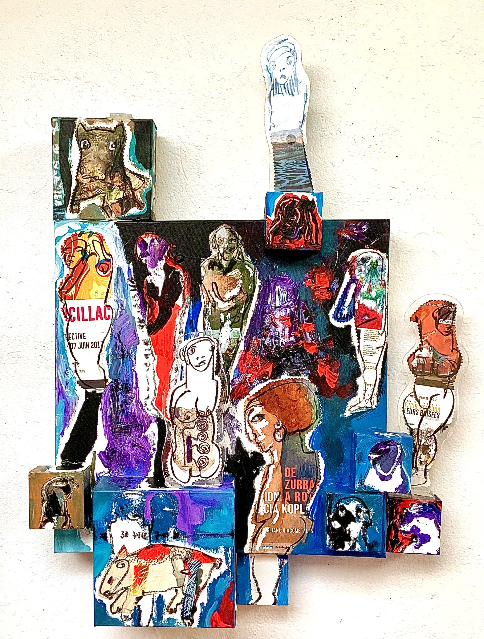 Soly utilise de grands mouvements spontanés, des accents texturés et des techniques abstraites pour former des illustrations qui reflètent la décadence de la moralité de la société et les conséquences de la mondialisation et de la modernisation. Ses peintures fusionnent les formes humaines et animales en des personnages informes tordus dans les ombres humaines de l’autre moi. Ces hybrides improbables dont les identités se perdent dans la traduction du passé au présent avec des lignes abstraites et des traits audacieux de nuances contrastées créent une configuration stratifiée formant le monde magique de Soly Cissé qui semble rempli de ses divinités.