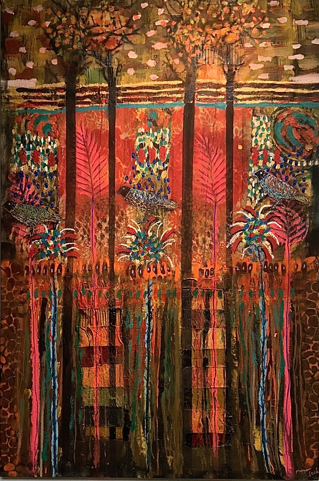 Unité dans la diversité. Momar Seck décrit ses créations comme des unités plurielles. Ses toiles et ses sculptures sont issues d’assemblage de matériaux divers comme autant de métaphores de la diversité du monde et de l’humain. Une palette colorée rehaussée d’incrustations dont des bouts d’étoffe et autres fragments qui ont, eux aussi, leur histoire. La variété des textures et des couleurs font de chaque création un symbole à la fois d’union et d’interdépendance fragile : une diversité qui ne tient qu’à un fil et qui pourtant est une force. Chaque œuvre apparait comme « une diversité singulière ».« Ma création est née de mon substrat culturel et se nourrit de croisements incessants avec d’autres cultures. »