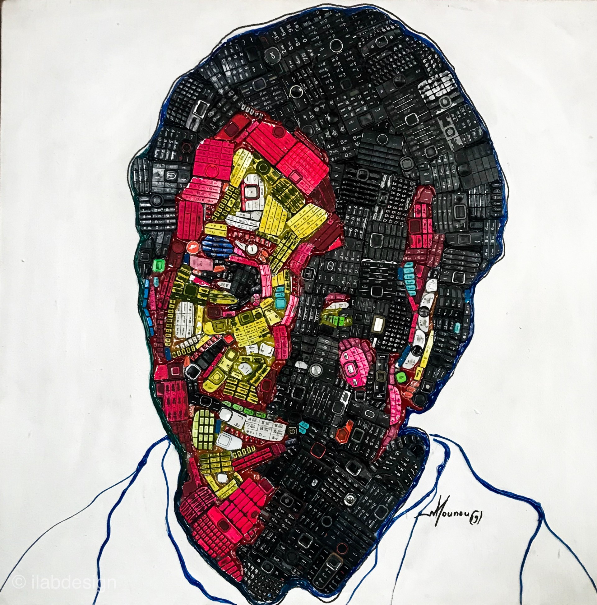 Un concept très créatif et une technique singulière qui le distinguent déjà et qui a totalement séduit Ilab-design. De surcroit, Mounou est un artiste attachant et simple. Son lieu de travail ressemble à ses tableaux et trouverait bien sa place dans une de ses oeuvres. Il vit dans un quartier précaire aux allures de bidonville.