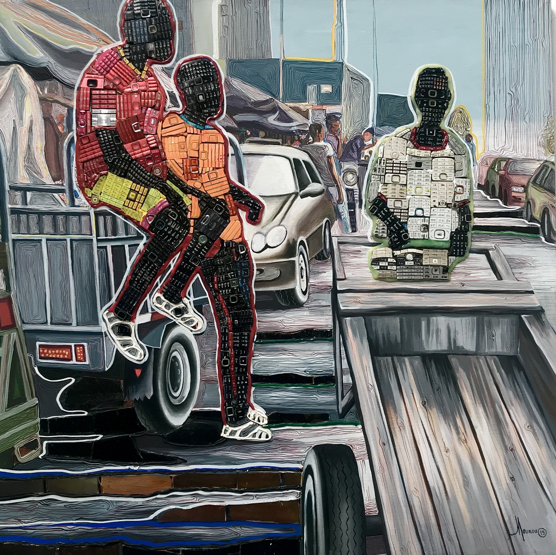 Nouvelle figure de la peinture contemporaine ivoirienne, Mounou Désiré Koffi dit “Mounou » interroge son époque en recyclant dans ses œuvres d’art des résidus électroniques.