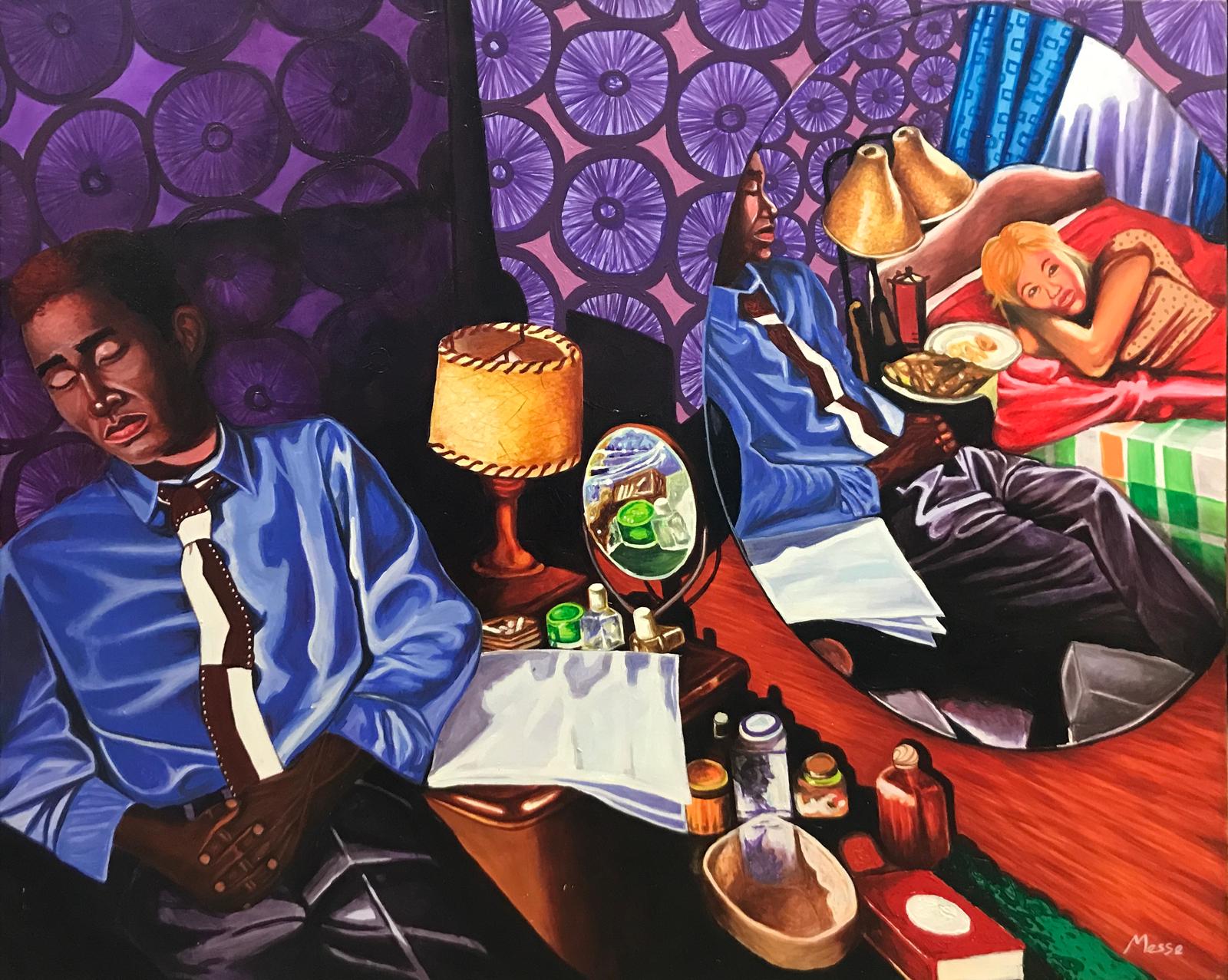 Messe artiste camerounais vivant depuis peu en France travaille sur des toiles utilisant de l’acrylique . Cette toile présente une scène intimiste évoqué par l’artiste évoquant la complexité des relations amoureuses faisant partie de sa série « Together but Apart »