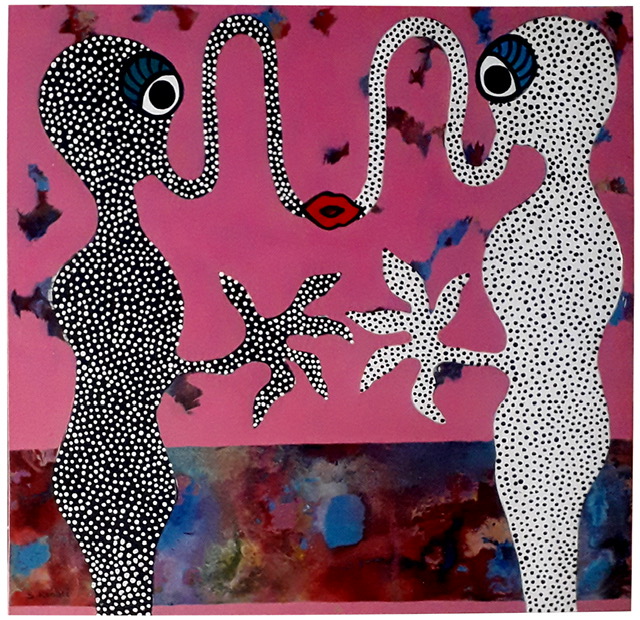Souleymane Konaté peint à l’acrylique sur toile. Il construit ses tableaux par couches successives: en utilisant différentes techniques telles que les éclaboussures, les marbrures et le collage. Ses personnages sont bidimensionnels,  leur profondeur est créée par la juxtaposition des couches. Elle est encore accentuée par des détails tels que des étoiles, des fleurs, des points ou d’autres symboles de différentes tailles, visibles à la fois sur l’arrière-plan et sur le corps des personnages eux-mêmes. Soul utilise des couleurs vibrantes, saturées et contrastées que la plupart des artistes n’oseraient pas combiner. Pourtant, ses compositions restent  très harmonieuses et parfaitement équilibrées. Groupés par deux ou plus, entrelacés ou reliés par un ruban, les sujets dégagent un sentiment de cohésion sociale et d’appartenance.