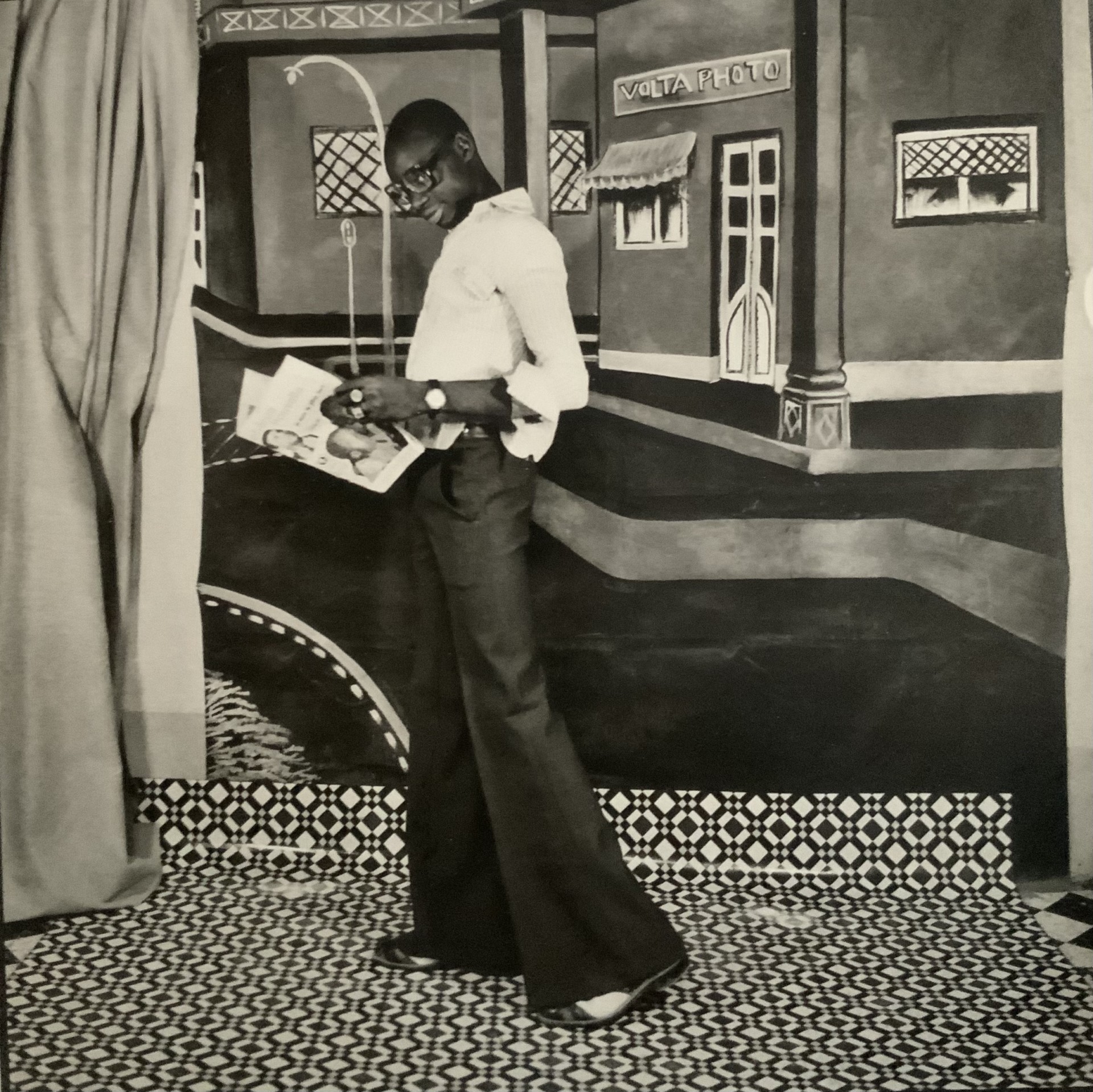 SANLÉ SORY photographe Burkinabé crée dans les années soixante, le Studio Volta Photo véritable espace de magie et de fantaisie sur plusieurs décennies (1960-1985). Ses photographies -archives vivantes ou instantanés de vie prises sur fonds de scènes peints, utilisent des accessoires de modernité de l’époque: téléphone, guitares, transistors, motos ou disques. Les vinyles symbolisent une véritable révolution culturelle post indépendance. Les photographies de Sanlé SORY célèbre les nuits yéyées de Bobo Dioulasso et sont la bande-son originale et pourtant silencieuse de ces années d’exubérance rythmée par la musique yéyé, le jazz, le rock ou les groupes voltaïques émergents – chacun y entend ce qu’il veut.