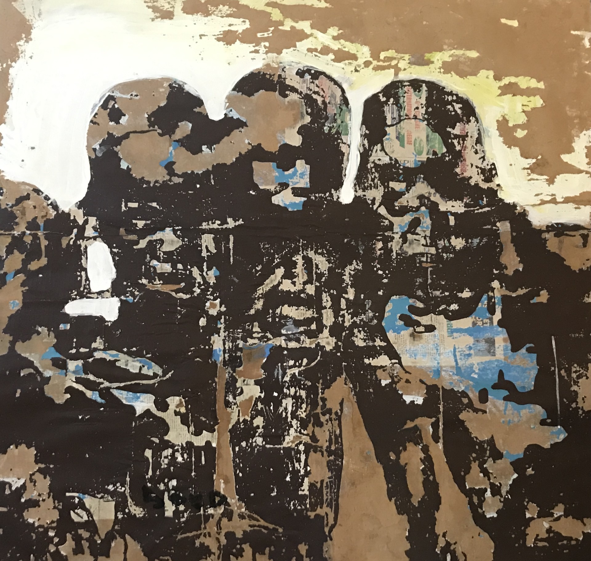 Les compositions d’Armand Boua (artiste ivoirien) se distinguent par une facture texturée grâce à l’usage du goudron, de l’acrylique, de papiers journal et de magazines mélés à des matériaux de récupération. Chaque couche est appliquée puis arrachée, dépouillée, laissant apparaitre des formes abstraites. Les mises en scènes sont, à l’image de la rue, déconstruites.