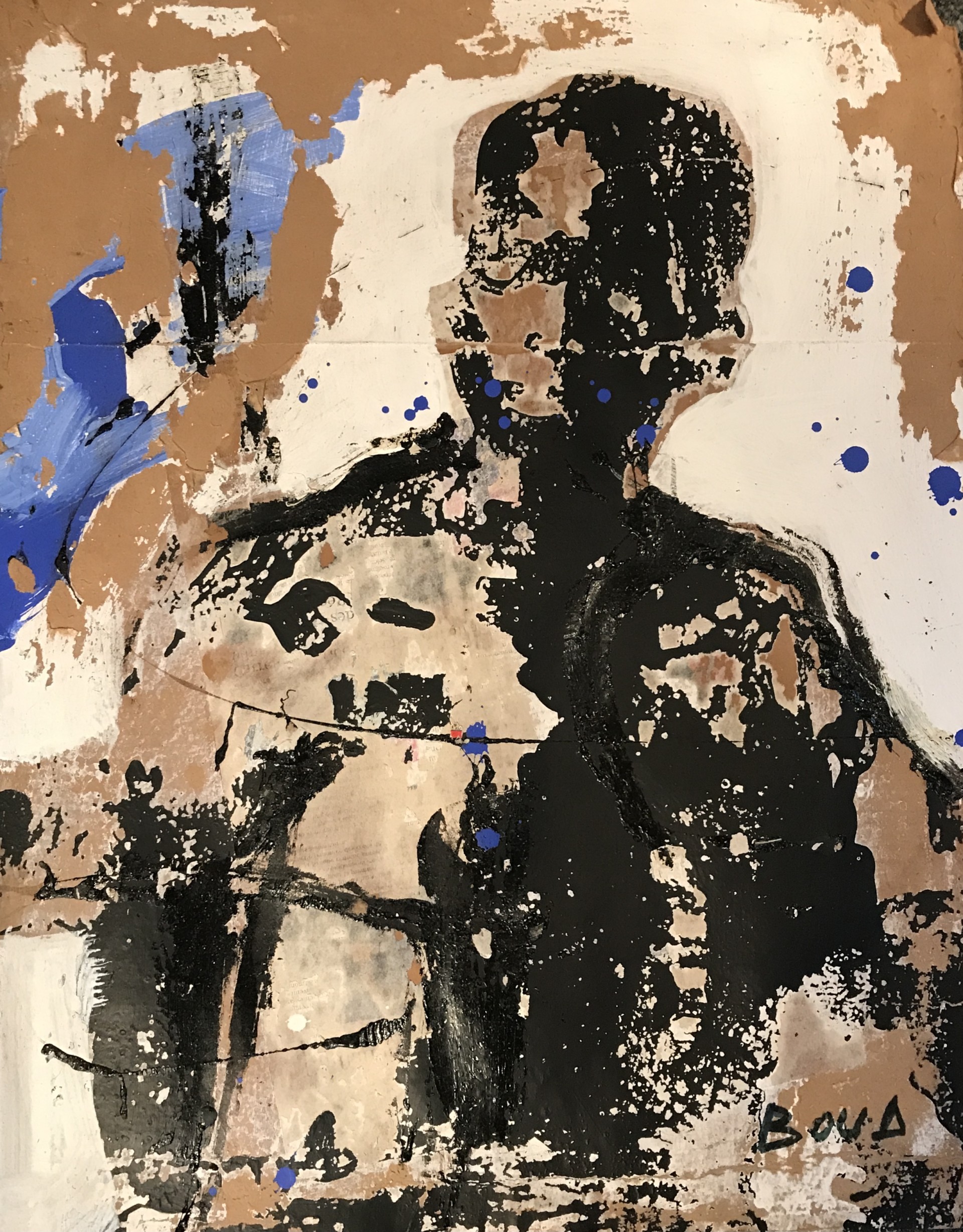 Les sujets de l’artiste ivoirien Armand Boua pourraient être victimes d’exploitation, ou symboles d’espoir et d’innocence. La gravité de la crise en 2002 qui a secoué la Côte d’Ivoire préfigure la pratique de l’artiste de rue, qui voit les atrocités de l’homme résonner dans la vie quotidienne et leur donne forme à travers la peinture et des mouvements émotionnels. Après avoir étudié à l’École nationale des beaux-arts et au Centre technique des arts appliqués à Abidjan, il s’est immergé dans le monde artistique, décrivant les vrais problèmes des jeunes enfants orphelins . Son principe est celui né de l’engagement avec du matériel trouvé, auquel il applique ses formes de signature qui invoquent des images et des scènes en souvenir. Boua est connu pour ses compositions texturées et stratifiées, utilisant du goudron et de l’acrylique sur des boîtes en carton trouvées. Chaque couche est appliquée, puis nettoyée et supprimée, laissant des formes abstraites qui vont et viennent. Il réalise un équilibre délicat entre ses gestes lourds, une exécution violente et le traitement doux de son sujet.