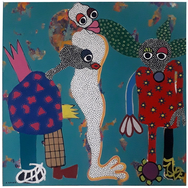 Au début dans le vide de l’univers,  tout à commencé par le son « YO » incluant tout et surtout la conscience humaine. Koni,  le dieu suprême et le créateur du monde,  a selon la mythologie bambara créé 3 esprits dont Faro- l’esprit de l’eau, Pemba – l’esprit de la terre et Teliclo – l’esprit de l’air . A travers la création de deux sets de jumeaux le monde a été peuplé d’animaux et de plantes ainsi que d’êtres humains tous issus des graines d’acacias . L’ancrage des racines /pieds  des personnages à la fois humain, végétal et animal est  représenté  dans les tableaux de Soul come une  base solide et unitaire . Cet ancrage représente la racine de l’évolution de l’homme dans cette mythologie où « tout est venu de rien » mais est en harmonie avec la  notion de racine commune de l’âme humaine .